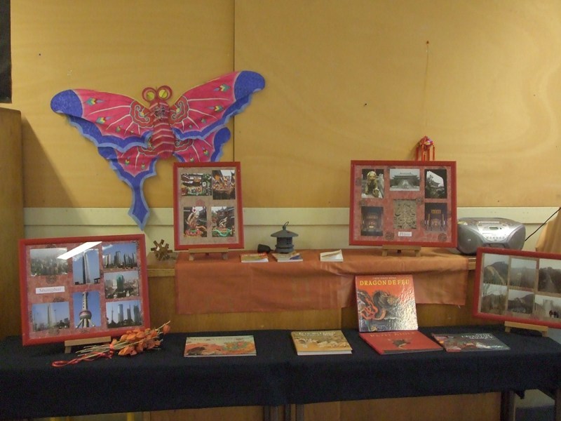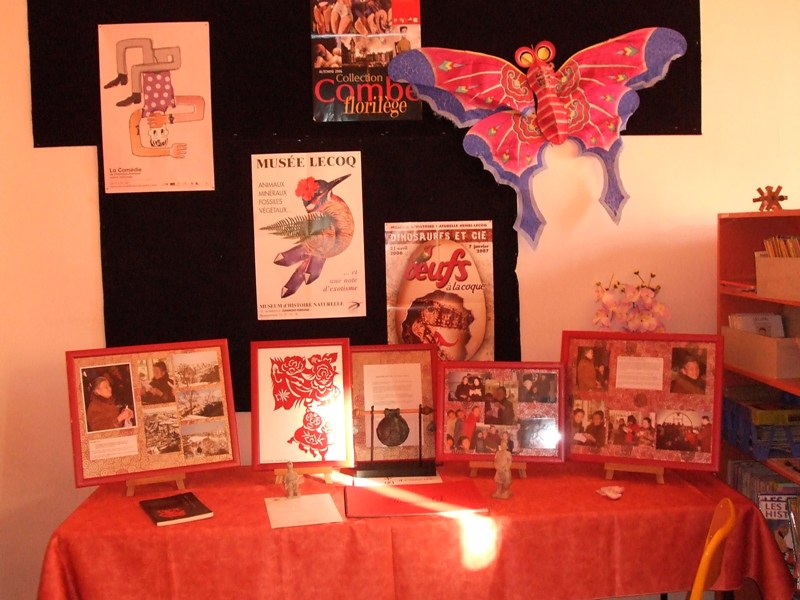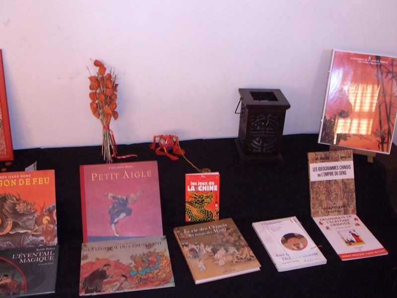 Cette exposition se compose d’objets chinois (Papiers découpés, cerfs volants, lanterne…) mais aussi de livres (une quarantaine : contes traditionnels chinois, livres sur la calligraphie, sur la culture chinoise, sur l’armée enterrée à Xian…)