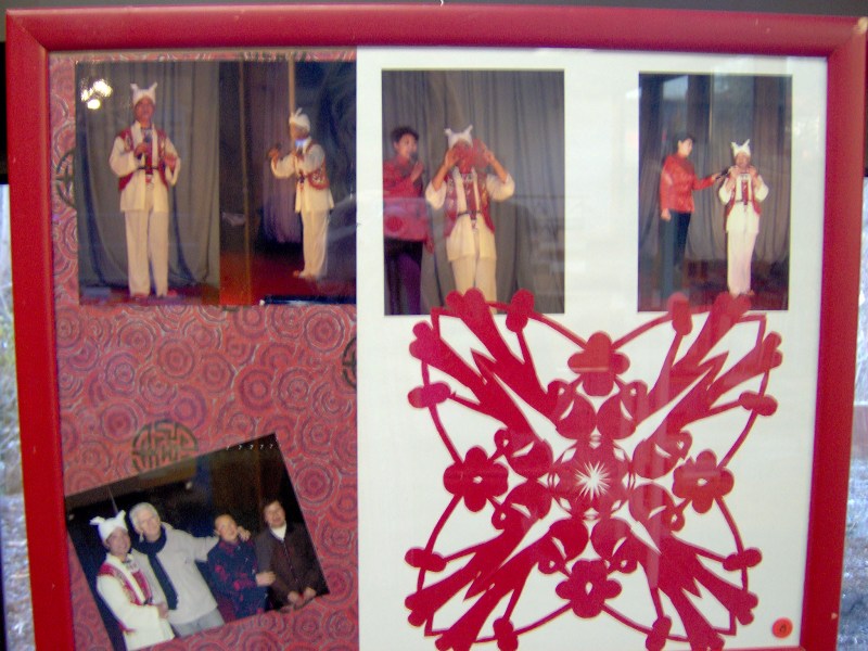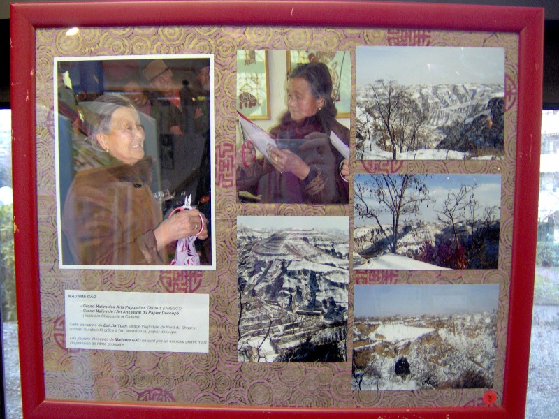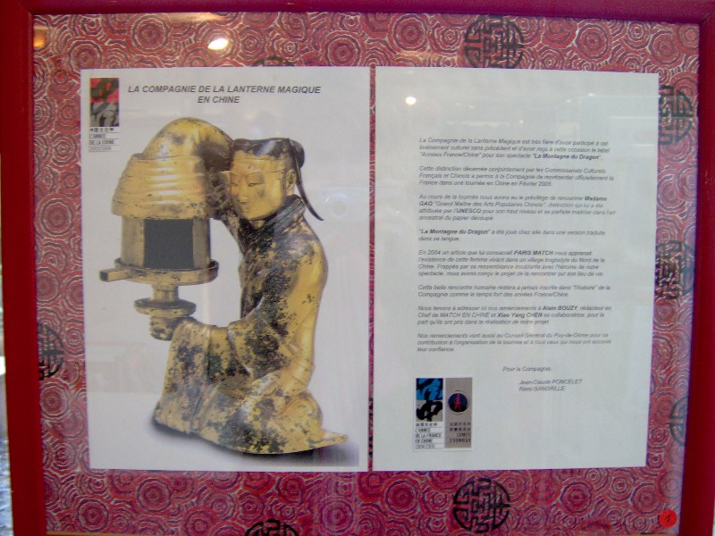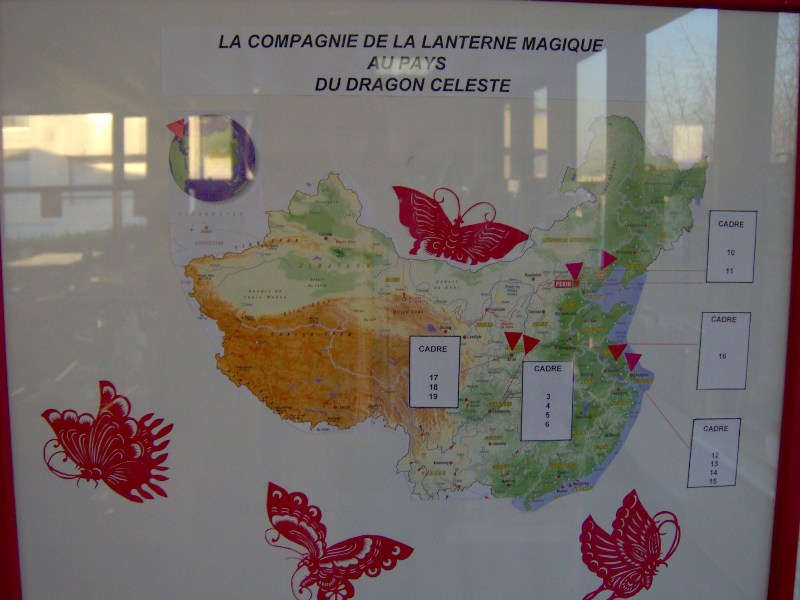 Nous avons également une quinzaine de cadres qui retracent la tournée de la Compagnie en Chine (Pékin, Shangai, X’ian, Shouzou, la rencontre avec madame Gao qui a reçu le prix de « Grand Maître de l’art populaire du papier découpé » par l’UNESCO,…)